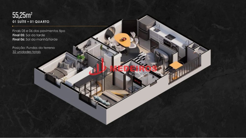 Este apartamento, com área privativa de 55,25 m², oferece um design moderno e funcional.